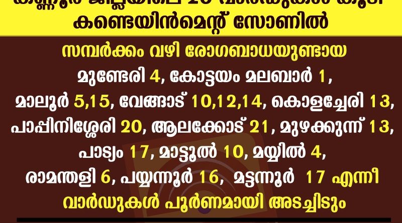 വാര്ത്തകള് പുതുതായി പ്രഖ്യാപിച്ച കണ്ടെയിന്മെന്റ് സോണുകൾ September 1, 2020 webdesk ഇന്ന് പുതുതായി പ്രഖ്യാപിച്ച കണ്ടെയിന്മെന്റ് സോണുകൾ .പൂര്ണ്ണമായും അടയ്ക്കുന്ന വാര്ഡുകള്: