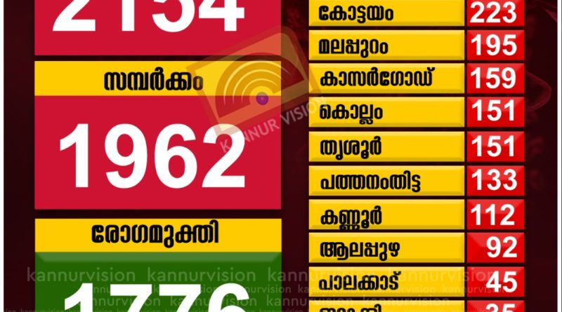 ഇന്ന് രോഗം സ്ഥിരീകരിച്ചവരില് 49 പേര് വിദേശ രാജ്യങ്ങളില് നിന്നും 110 പേര് മറ്റ് സംസ്ഥാനങ്ങളില് നിന്നും വന്നതാണ്. 1962 പേര്ക്ക് സമ്പര്ക്കത്തിലൂടെയാണ് രോഗം ബാധിച്ചത്. അതില് 174 പേരുടെ സമ്പര്ക്ക ഉറവിടം വ്യക്തമല്ല. തിരുവനന്തപുരം ജില്ലയില് നിന്നുള്ള 305 പേര്ക്കും, കോഴിക്കോട് ജില്ലയില് നിന്നുള്ള 292 പേര്ക്കും, കോട്ടയം ജില്ലയില് നിന്നുള്ള 212 പേര്ക്കും, എറണാകുളം ജില്ലയില് നിന്നുള്ള 202 പേര്ക്കും, മലപ്പുറം ജില്ലയില് നിന്നുള്ള 184 പേര്ക്കും, തൃശൂര് ജില്ലയില് നിന്നുള്ള 145 പേര്ക്കും, കൊല്ലം ജില്ലയില് നിന്നുള്ള 142 പേര്ക്കും, കാസര്ഗോഡ് ജില്ലയില് നിന്നുള്ള 139 പേര്ക്കും, പത്തനംതിട്ട ജില്ലയില് നിന്നുള്ള 107 പേര്ക്കും, കണ്ണൂര് ജില്ലയില് നിന്നുള്ള 90 പേര്ക്കും, ആലപ്പുഴ ജില്ലയില് നിന്നുള്ള 88 പേര്ക്കും, പാലക്കാട് ജില്ലയില് നിന്നുള്ള 26 പേര്ക്കും, ഇടുക്കി ജില്ലയില് നിന്നുള്ള 23 പേര്ക്കും, വയനാട് ജില്ലയില് നിന്നുള്ള 7 പേര്ക്കുമാണ് ഇന്ന് സമ്പര്ക്കത്തിലൂടെ രോഗം ബാധിച്ചത്.