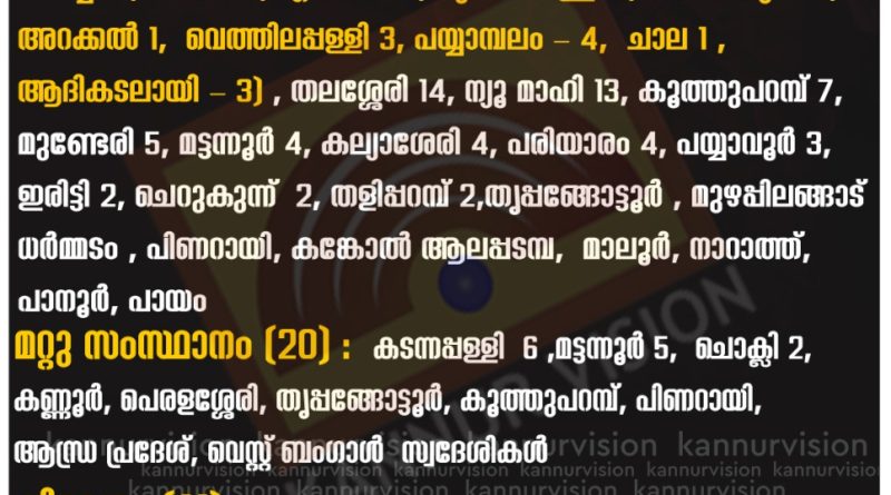 ജില്ലയില് 142 പേര്ക്ക് കൊവിഡ് ബാധ സ്ഥിരീകരിച്ചു. 118 പേര്ക്ക് സമ്പര്ക്കം മൂലമാണ് രോഗബാധ. ഒരാള് വിദേശത്തു നിന്നും 20 പേര് ഇതര സംസ്ഥാനങ്ങളില് നിന്നും എത്തിയവരാണ്. മൂന്ന് ആരോഗ്യ പ്രവര്ത്തകര്ക്കും പുതുതായി രോഗം സ്ഥിരീകരിച്ചു.
