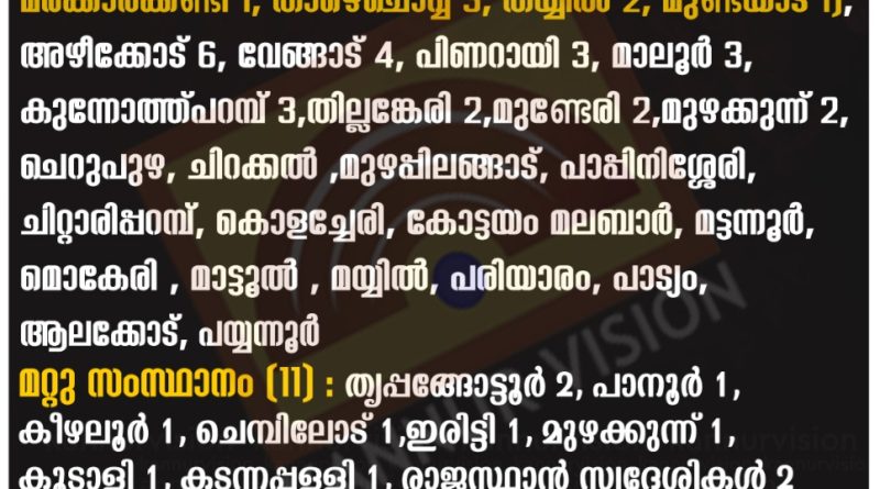 തലശ്ശേരി ചാലില് 36കാരന്, 14കാരന്, 12കാരന്, 17കാരന്, 58കാരി