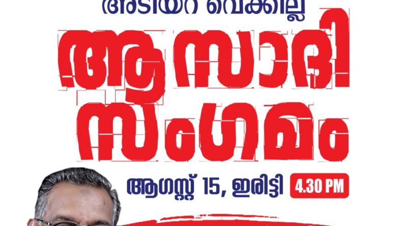 രാജ്യത്തിന്റെ 76 ാം സ്വാതന്ത്ര്യദിനമായ 2022 ആഗസ്ത് 15 ന് സംസ്ഥാന കമ്മിറ്റിയുടെ ആഹ്വാനപ്രകാരം SDPI കണ്ണൂർ ജില്ലാ കമ്മിറ്റി ‘സ്വാതന്ത്ര്യം അടിയറവെക്കില്ല’ എന്ന മുദ്രാവാക്യമുയര്‍ത്തി ഇരിട്ടിയിൽ ആസാദി സംഗമം സംഘടിപ്പിക്കുമെന്ന്
