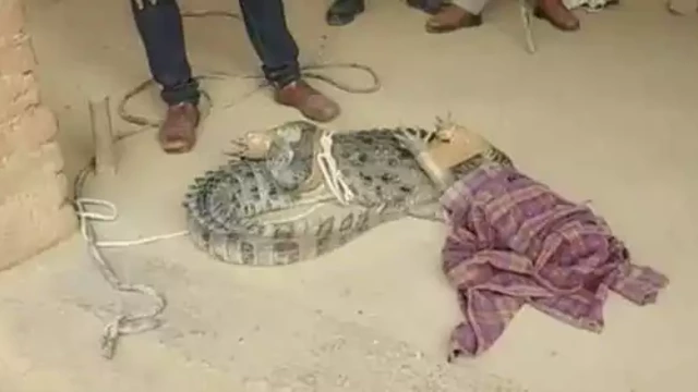 ഉത്തർപ്രദേശിലെ ഒരു ഗ്രാമത്തിൽ താമസിക്കുന്ന കുടുംബമാണ് രാത്രിയിൽ വീടിനുള്ളിൽ പ്രതീക്ഷിക്കാത്ത അതിഥിയെ കണ്ട് ഞെട്ടിയത്. മുതലയ്ക്ക് എട്ടടി നീളമുണ്ടായിരുന്നു. ഗുജറാത്തിലെ ജയ്തിയ ഗ്രാമത്തിൽ ശനിയാഴ്ച രാത്രിയാണ് സംഭവം. രാത്രി കുടുംബം ഉറങ്ങുകയായിരുന്നു, വീട്ടുടമസ്ഥൻ ഹർണം സിംഗ് പറയുന്നു. ആ സമയത്താണ് മുതല വീടിനുള്ളിലേക്ക് കടന്നത്. ഭക്ഷണം തേടി മുതല വീട്ടിൽ പ്രവേശിച്ചതാകാമെന്നാണ് ഹർണം സിംഗ് കരുതുന്നത്.