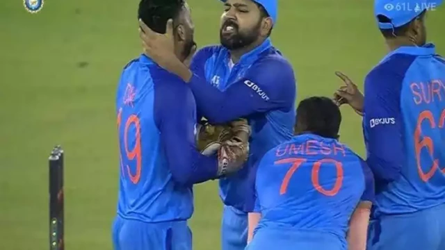 മത്സരത്തിനിടെ ഇന്ത്യൻ ക്യാപ്റ്റൻ രോഹിത് ശര്‍മ വിക്കറ്റ് കീപ്പർ ദിനേഷ് കാർത്തിക്കിന്റെ കഴുത്തിനു പിടിച്ചതാണ് ആരാധകർക്കിടയിലെ ഇപ്പോഴത്തെ ചർച്ചാ വിഷയം. മുൻ ഓസ്ട്രേലിയൻ ക്യാപ്റ്റൻ സ്റ്റീവ് സ്മിത്തും 24 പന്തിൽ 35 റൺസ് നേടി. 12-ാം ഓവറിൽ സ്മിത്തിനെ പുറത്താക്കിയതിനെ തുടർന്നാണ് നാടകീയ സംഭവങ്ങളാണ് അരങ്ങേറിയത്.