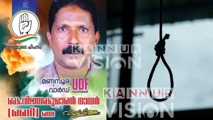 തെരഞ്ഞെടുപ്പ് ഫലം വന്ന ശനിയാഴ്ച ഉച്ചയോടെ മരത്തില് തൂങ്ങിമരിക്കാൻ ശ്രമിച്ചിരുന്നു. ഇത് മകൻ കണ്ടതോടെ ഉടൻ തന്നെ ആശുപത്രിയില് എത്തിക്കുകയായിരുന്നു. മണമ്ബൂരില് വിജയിച്ചത് ബിജെപി സ്ഥാനാർത്ഥിയാണ്. വിജയകുമാരൻ നായർ മൂന്നാം സ്ഥാനത്തേക്ക് തള്ളപ്പെട്ടു. തെരഞ്ഞെടുപ്പില് തോറ്റതില് മനോവിഷമം ഉണ്ടായിരുന്നതായി ബന്ധുക്കള് അറിയിച്ചു. സ്വകാര്യ ആശുപത്രിയില് ചികിത്സയിലിരിക്കെ ഇന്ന് പുലർച്ചെയാണ് മരിച്ചത്.
