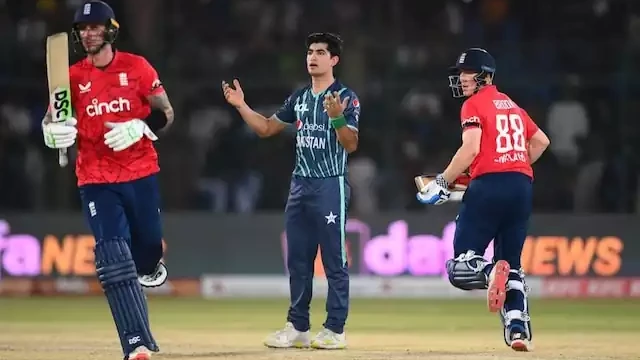 കറാച്ചി: പാകിസ്ഥാൻ-ഇംഗ്ലണ്ട് ടി-20 പരമ്പരയിലെ ആദ്യ മത്സരത്തിൽ പാകിസ്ഥാനെ ഇംഗ്ലണ്ട് തോൽപ്പിച്ചു. ടോസ് നഷ്ടപ്പെട്ട് ബാറ്റിംഗിനിറങ്ങിയ പാക്കിസ്ഥാൻ നിശ്ചിത ഓവറിൽ ഏഴ് വിക്കറ്റ് നഷ്ടത്തിൽ 158 റൺസ് നേടി. മറുപടി ബാറ്റിംഗിനിറങ്ങിയ ഇംഗ്ലണ്ട് 19.2 ഓവറിൽ നാല് വിക്കറ്റ് നഷ്ടത്തിൽ ലക്ഷ്യം കണ്ടു. 40 പന്തിൽ 53 റൺസെടുത്ത അലക്സ് ഹെയ്ൽസാണ് ഇംഗ്ലണ്ടിന്റെ ടോപ് സ്കോറർ. ഹാരി ബ്രൂക്ക് 25 പന്തിൽ 42 റൺസുമായി പുറത്താകാതെ നിന്നു.