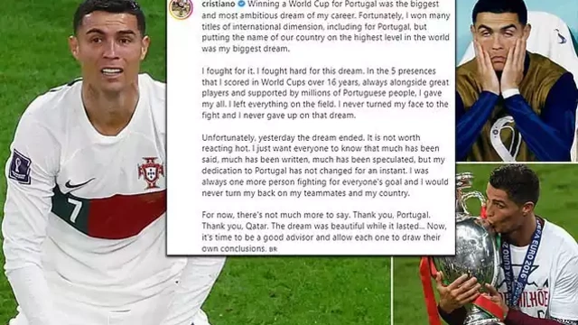 ദോഹ: പോർച്ചുഗലിനായി ലോകകപ്പ് നേടുക എന്നത് തന്‍റെ കരിയറിലെ ഏറ്റവും വലിയ സ്വപ്നമാണെന്നും നിർഭാഗ്യവശാൽ തനിക്ക് കഴിഞ്ഞില്ലെന്നും ക്രിസ്റ്റ്യാനോ റൊണാൾഡോ പറഞ്ഞു. പോർച്ചുഗലിനോടുള്ള തന്‍റെ അർപ്പണബോധം ഒരു നിമിഷം പോലും മാറിയിട്ടില്ലെന്ന് ക്രിസ്റ്റ്യാനോ സോഷ്യൽ മീഡിയയിൽ കുറിച്ചു. 16 വർഷത്തോളം താൻ അതിനായി പോരാടി.