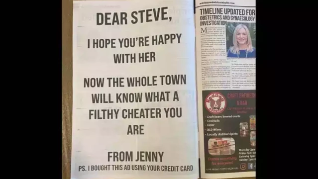 തന്റെ കാമുകൻ സ്റ്റീവിനോട് പ്രതികാരം ചെയ്യാൻ ജെന്നി വളരെ വ്യത്യസ്തമായ ഒരു മാർഗമാണ് തിരഞ്ഞെടുത്തത്. ഓഗസ്റ്റ് 12 ന്, ജെന്നി തന്റെ കാമുകനെക്കുറിച്ചുള്ള ഒരു മുഴുനീള പേജ് പരസ്യം ഓസ്ട്രേലിയൻ പത്രമായ മക്കേ ആൻഡ് വിറ്റ്സണ്ടേ ലൈഫിൽ പ്രസിദ്ധീകരിച്ചു. “പ്രിയപ്പെട്ട സ്റ്റീവ്, നീ അവളോടൊപ്പം സുഖമായിരിക്കുന്നുവെന്ന് കരുതുന്നു. നീ ഒരു വഞ്ചകനാണെന്ന കാര്യം നാടു മുഴുവന് അറിയട്ടെ” എന്നായിരുന്നു പരസ്യം. ഈ പരസ്യത്തിനുള്ള പണം കാമുകന്റെ ക്രെഡിറ്റ് കാർഡിൽ നിന്നാണ് നൽകിയതെന്നും അതിൽ പ്രത്യേകം പരാമർശിക്കുന്നു.