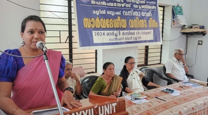 മയ്യിൽ:കേരളാ സ്റ്റേറ്റ് സർവീസ് പെൻഷണേഴ്സ് യൂനിയൻ മയ്യിൽ ബ്ലോക്ക് വനിതാവേദിയുടെ ആഭിമുഖ്യത്തിൽ മാർച്ച് 8 സാർവദേശീയ വനിതാ ദിനമായി ആചരിച്ചു. ബ്ളോക്ക് വനിതാവേദി ചേർ പേഴ്സൻ കെ. ജ്യോതി ടീച്ചറുടെ അധ്യക്ഷതയിൽ മയ്യിൽ പെൻഷൻ ഭവനിൽ നടന്ന പരിപാടികണ്ണൂർ ജില്ലാ പബായത്ത് മെമ്പർ എൻ.വി. ശ്രീജി നി ഉദ്ഘാടനം ചെയ്തു. തുല്യ നീതി, സാമൂഹ്യ സുരക്ഷിതത്വം എന്നീ വിഷയങ്ങളിൽ ഊന്നിക്കൊണ്ട് അഡ്വ: പി.ഓമനമുഖ്യ പ്രഭാഷണം നടത്തി. തുടർന്ന് ജില്ലാ സിക്രട്ടറി ഇ. മുകുന്ദൻ ,ബ്ലോക്ക് പ്രസിഡന്റ് കെ.വി. യശോദ ടീച്ചർ, മുൻ ബ്ലോക്ക് പ്രസിഡന്റമാരായ കെ.പത്മനാഭൻ മാസ്റ്റർ, കെ.ബാലകൃഷ്ണൻ നായർ ,വി.രമാദേവി ടീച്ചർ,കെ.എം. പാർവതി ടീച്ചർ, എം.കെ പ്രേമി എന്നിവർ സംസാരിച്ചു. തുടർന്ന് വനിതകൾ നടത്തിയ കവിതാ ഗാനാലാപനങ്ങൾ, സംഘഗാനം, നൃത്തം എന്നിവയും അരങ്ങേറി. ബ്ലോക്ക് കൺവീനർ കെ. കെ. ലളിതകുമാരി ടീച്ചർ സ്വാഗതവും പി.സി.പി.കമലാക്ഷി ടീച്ചർ നന്ദിയും പറഞ്ഞു.