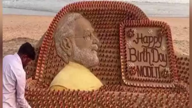 ഒഡീഷയിലെ പുരി ബീച്ചിൽ പ്രധാനമന്ത്രി നരേന്ദ്ര മോദിയുടെ ശിൽപം സൃഷ്ടിച്ച് ജന്മദിനാശംസകൾ നേർന്ന് പ്രശസ്ത സാൻഡ് ആർട്ടിസ്റ്റ് സുദർശൻ പട്നായിക്. ഇന്ന് എഴുപത്തിരണ്ടാം പിറന്നാൾ ആഘോഷിക്കുന്ന പ്രധാനമന്ത്രിക്ക് തന്‍റെ അതുല്യമായ രീതിയിലാണ് പട്നായിക്ക് ആശംസകൾ നേർന്നത്. 1,213 മഡ് ടീ കപ്പുകൾ ഉപയോഗിച്ചാണ് അദ്ദേഹം ഇൻസ്റ്റലേഷൻ പീസ് നിർമ്മിച്ചത്. മനോഹരമായ തൻ്റെ കലാസൃഷ്ടിയുടെ ചിത്രമുൾപ്പെട്ട പോസ്റ്റ് പട്നായിക് ട്വിറ്ററിൽ പങ്കുവച്ചു.