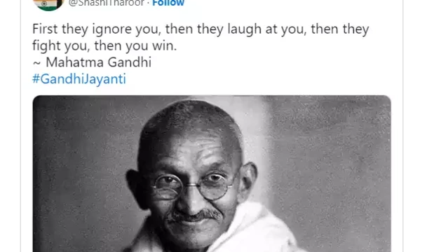 ന്യൂദല്‍ഹി: കോണ്‍ഗ്രസ് അധ്യക്ഷ തെരഞ്ഞെടുപ്പിനിടെ ഗാന്ധി ജയന്തി ദിനം പ്രമാണിച്ച് ശശി തരൂര്‍ സമൂഹ മാധ്യമത്തില്‍ കുറിച്ച മഹാത്മാ ഗാന്ധിയുടെ വചനം ശ്രദ്ധേയമാകുന്നു. ആദ്യം അവര്‍ നിങ്ങളെ അവഗണിക്കും, പിന്നെ അവര്‍ നിങ്ങളെ നോക്കി കളിയാക്കും, പിന്നീട് അവര്‍ നിങ്ങളോട് പോരാടും, അപ്പോള്‍ നിങ്ങള്‍ ജയിക്കും,’ എന്ന ഗാന്ധിയുടെ വാക്കുകളാണ് തരൂർ ട്വീറ്റ് ചെയ്തിരിക്കുന്നത്.