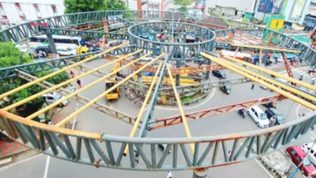 2016 ഫെബ്രുവരിയിലാണ് കോട്ടയത്തെ അഞ്ച് റോഡുകൾ ചേരുന്നിടത്ത് റോഡ് മുറിച്ചുകടക്കുന്നതിനുപകരം ആളുകൾക്ക് സുരക്ഷിതമായി മുകളിലൂടെ കയറി ഇറങ്ങാൻ സാധിക്കുന്ന ആകാശ പാതയുടെ നിർമ്മാണം ആരംഭിച്ചത്. 5.75 കോടിയുടെ പദ്ധതിക്കായി ഇതിനകം ഒന്നേമുക്കാൽ കോടി ചെലവഴിച്ച് 14 ഇരുമ്പു തൂണുകളിൽ 24 മീറ്റർ ചുറ്റളവിൽ ഇരുമ്പു പ്ലാറ്റ്ഫോം നിർമിച്ചു.