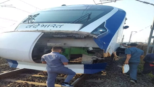 അതുൽ റെയിൽവേ സ്റ്റേഷന് സമീപം ട്രാക്കിൽ കയറിയ കാളയെയാണ് വന്ദേഭാരത് ട്രെയിൻ ഇടിച്ചത്. കൂട്ടിയിടിയുടെ ആഘാതത്തിൽ ട്രെയിനിന്റെ മുൻഭാഗം തകർന്നു. ഇത്തരം അപകടങ്ങളിൽ ട്രെയിനിന്റെ മറ്റ് ഭാഗങ്ങളിൽ ആഘാതം ഒഴിവാക്കുന്നതിനായി വന്ദേഭാരത് ട്രെയിൻ പ്രത്യേകം രൂപകൽപ്പന ചെയ്തിട്ടുണ്ട്. അതിനാൽ, ഇത് വളരെ വേഗത്തിൽ മാറ്റിവയ്ക്കാൻ കഴിയുമെന്ന് റെയിൽവേ അധികൃതർ വിശദീകരിച്ചു.