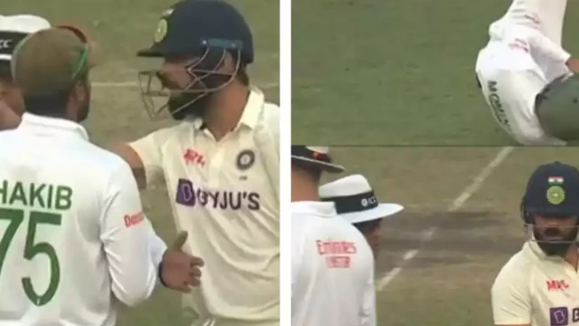 ബംഗ്ലദേശിൻ്റെ മെഹ്ദി ഹസൻ മിറാസ് എറിഞ്ഞ 20–ാം ഓവറിൽ മോമിനുൾ ഹഖ് ക്യാച്ചെടുത്താണ് കോഹ്ലി പുറത്തായത്. തുടർന്ന് ബംഗ്ലാദേശ് ക്യാപ്റ്റൻ ഷാക്കിബ് അൽ ഹസനുമായി കോഹ്ലി തർക്കത്തിലേർപ്പെട്ടു. പിന്നാലെ അംപയർമാർ ഇടപെട്ട് കോഹ്ലിയെ ഫീൽഡിന് പുറത്തേക്ക് അയച്ചു. സംഭവത്തിന്റെ ദൃശ്യങ്ങൾ സോഷ്യൽ മീഡിയയിൽ വൈറലായിട്ടുണ്ട്.